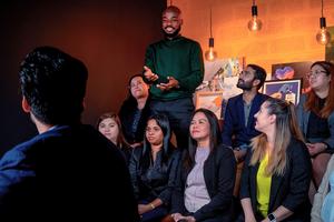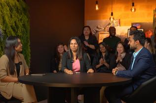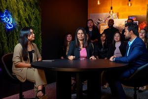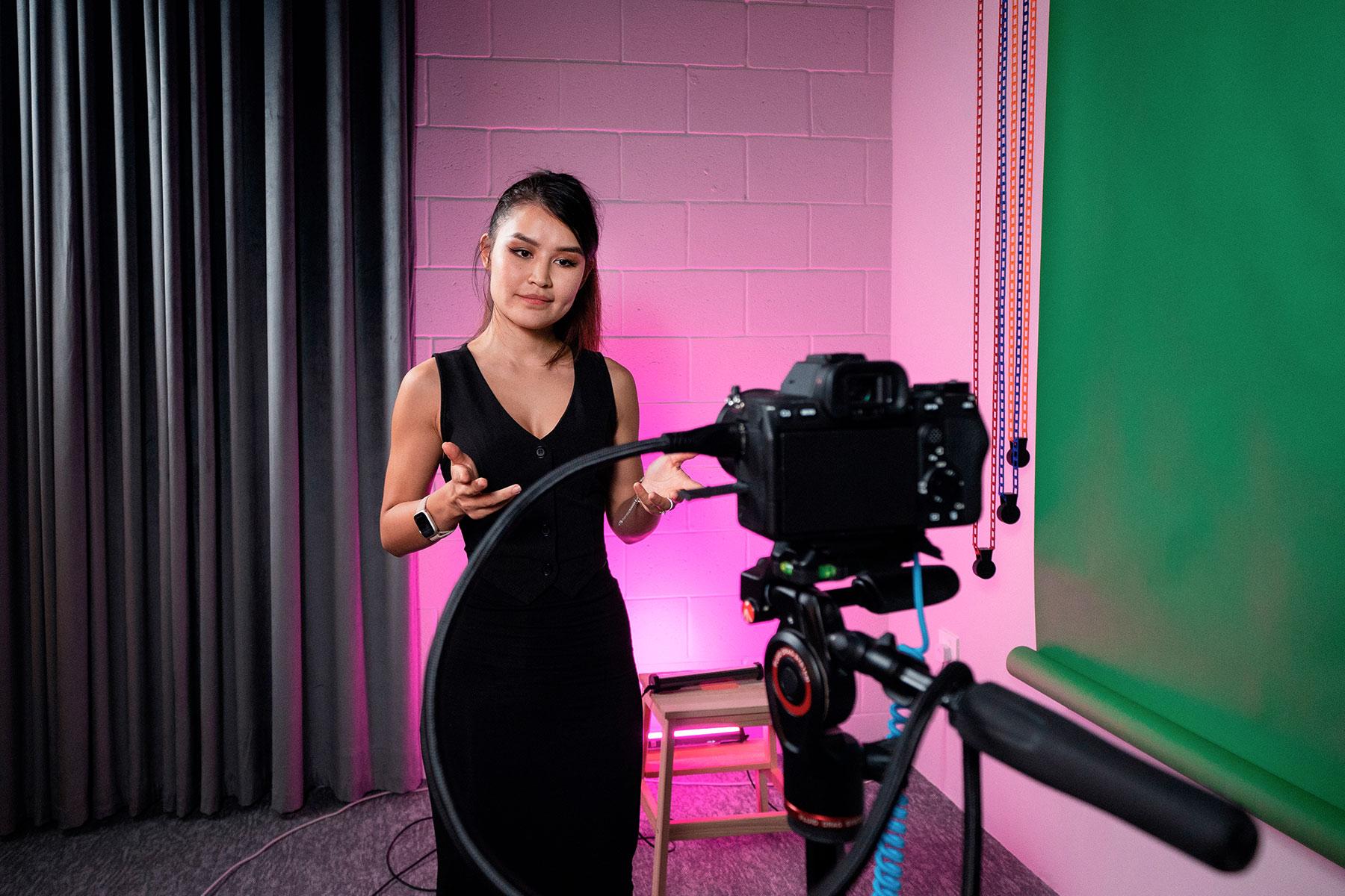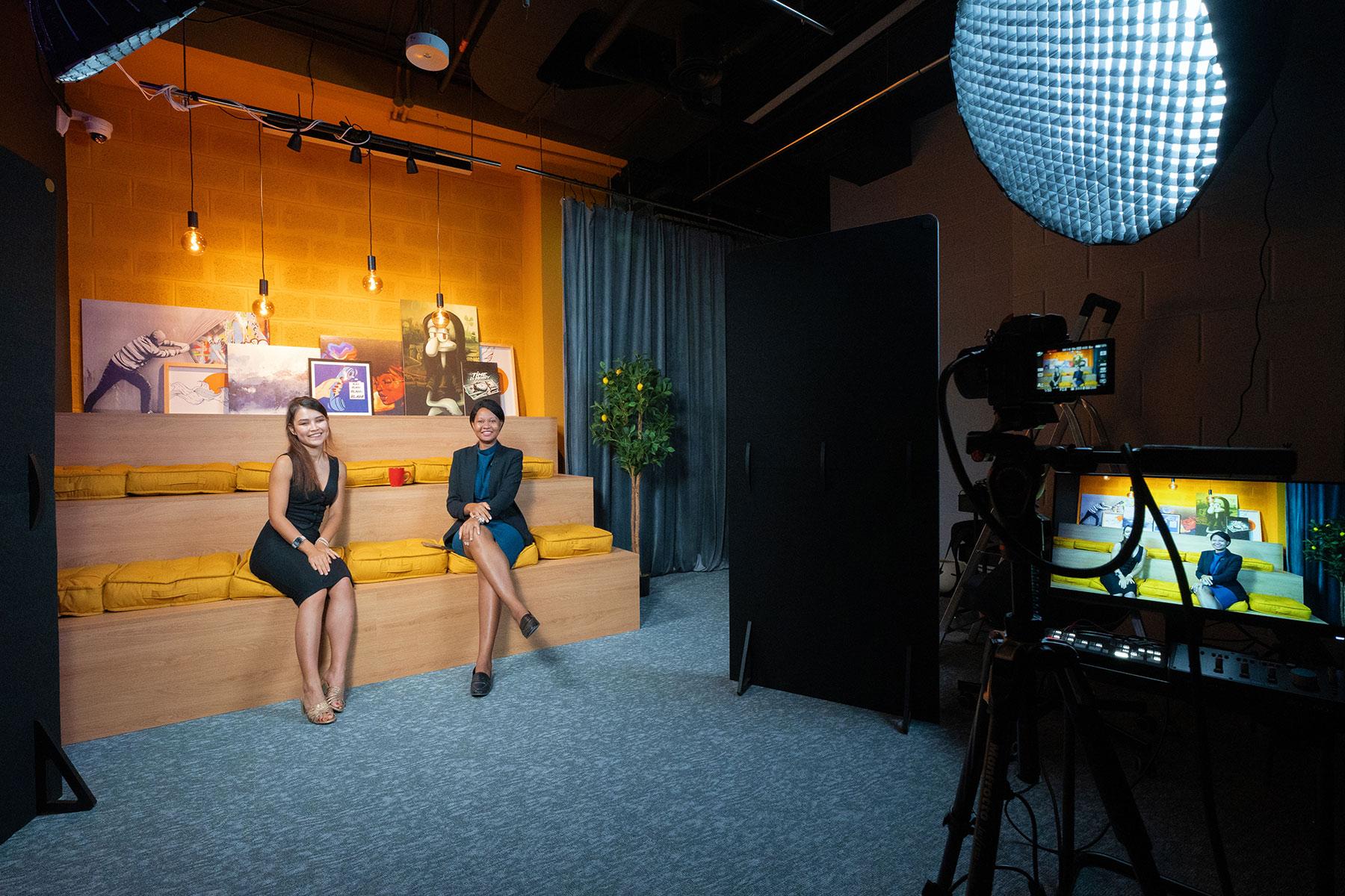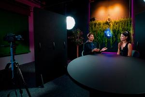 The room accommodates up to 4 speakers and guests. Enjoy comfortable seating, a dressing area, and a relaxing lounge. We’ve thought of everything so you can share your story with the world.